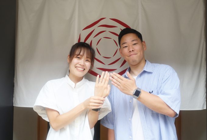 指輪内側に、記念日やお名前などお入れできます。ひらがなや漢字、カタカナ、アルファベットにて、おふたりの想いをお刻みください。
